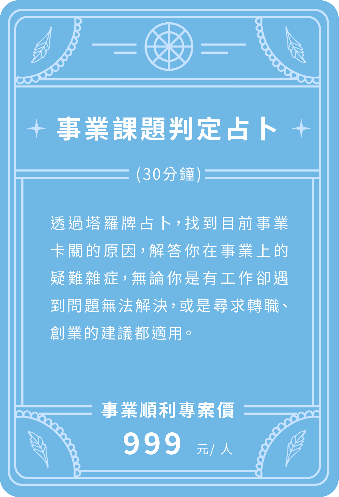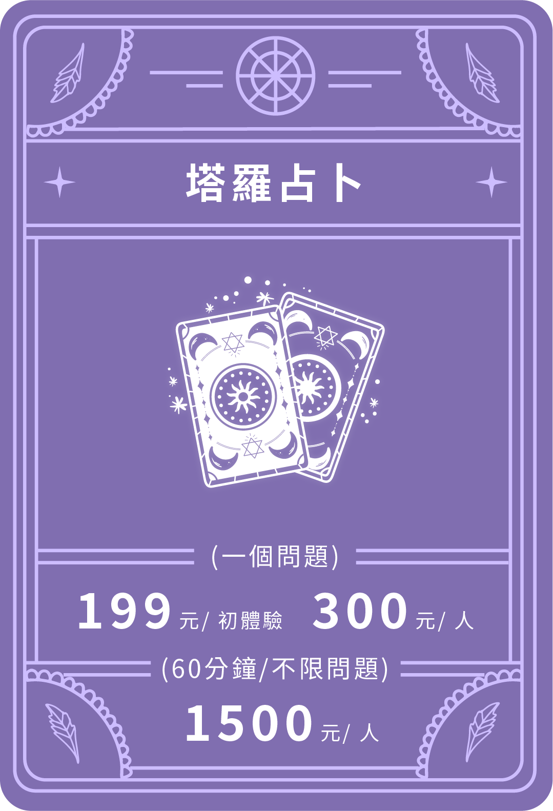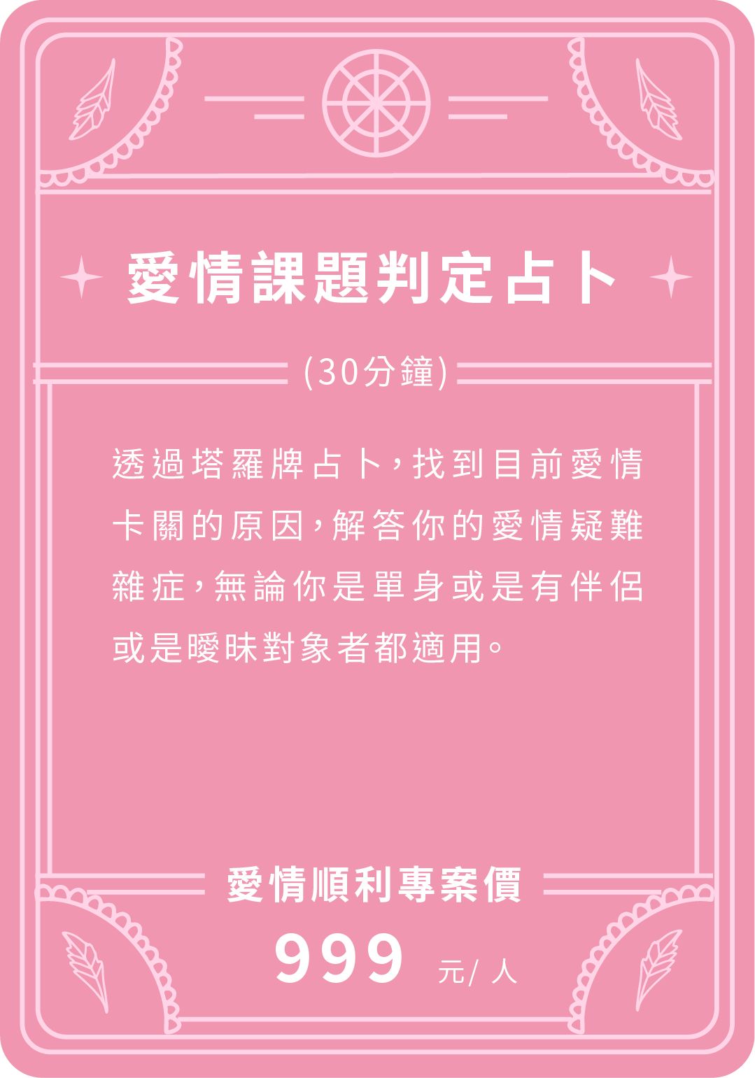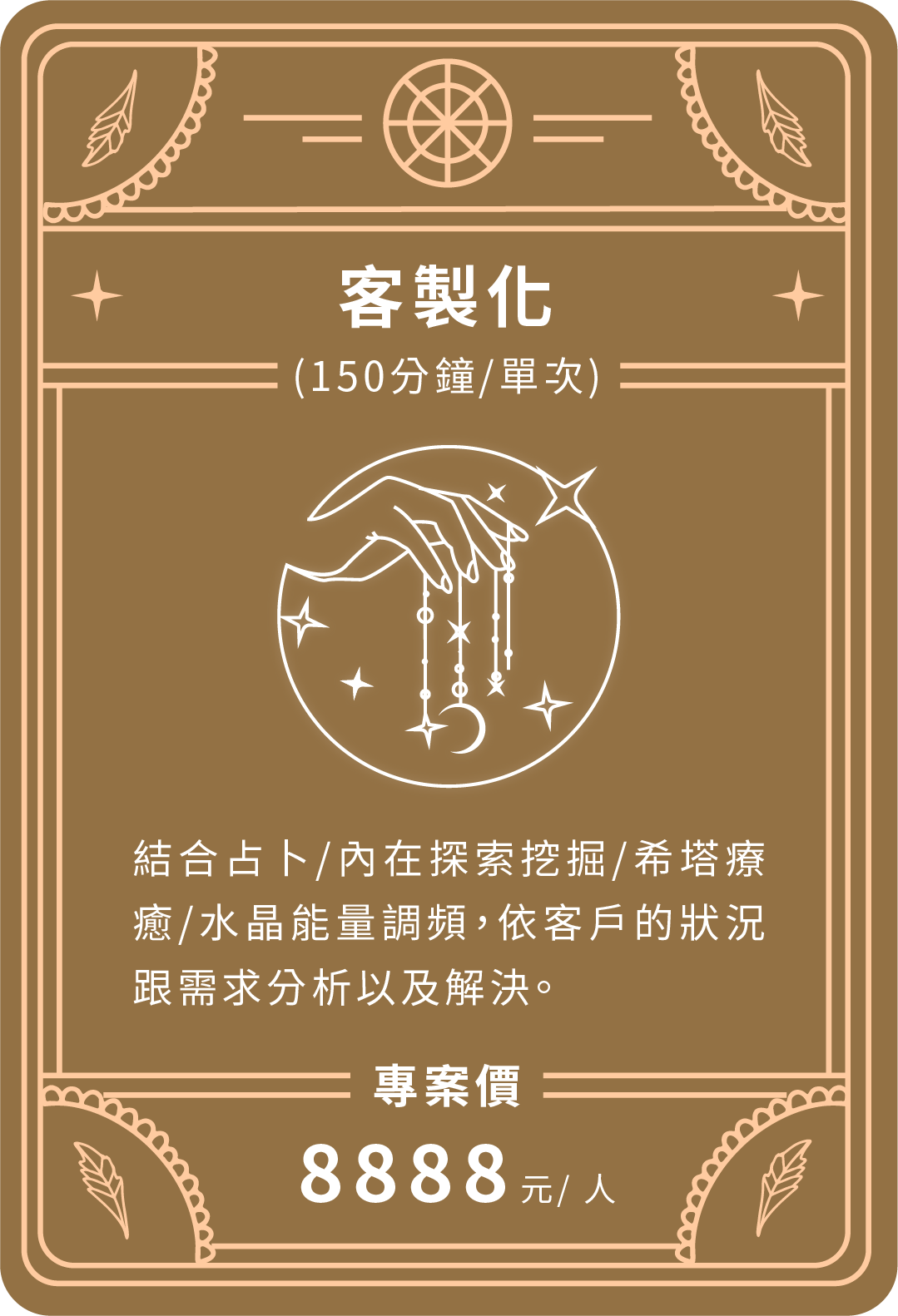 第二階段是判讀,依據您的狀況,她會使用塔羅占卜或潛意識溝通卡進行判讀,找出您內在未解決的課題,並提供解決方案或建議,時間約30-60分鐘。