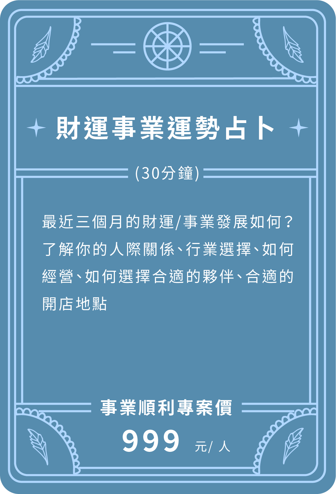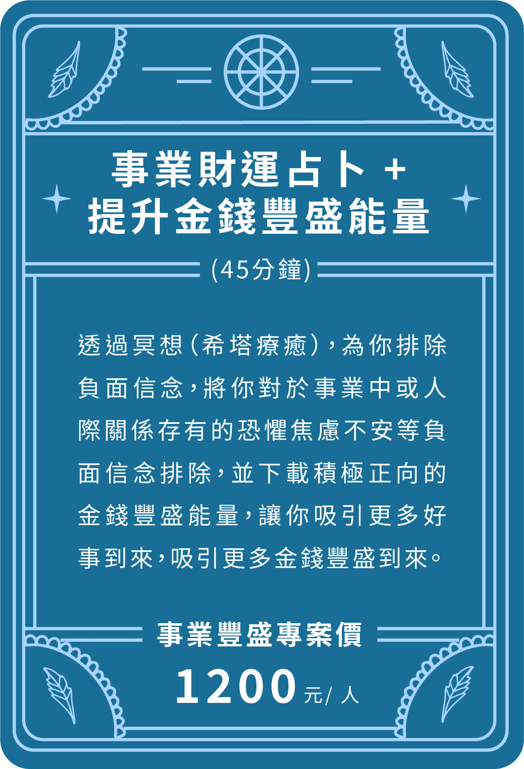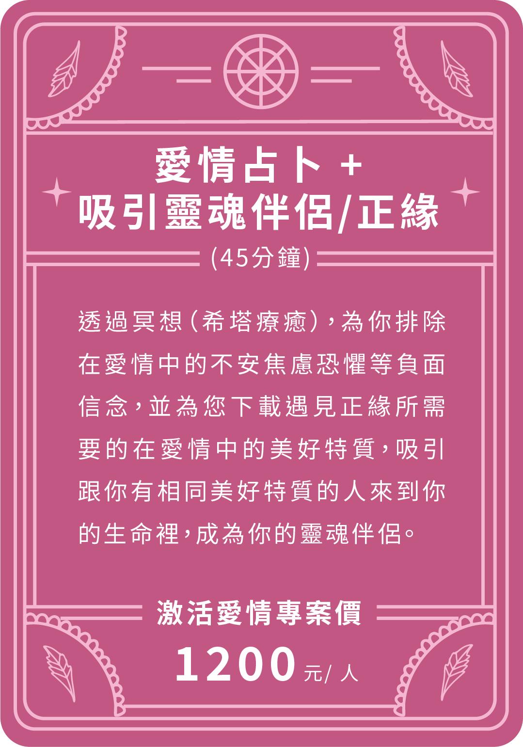 第二階段是判讀,依據您的狀況,她會使用塔羅占卜或潛意識溝通卡進行判讀,找出您內在未解決的課題,並提供解決方案或建議,時間約30-60分鐘。