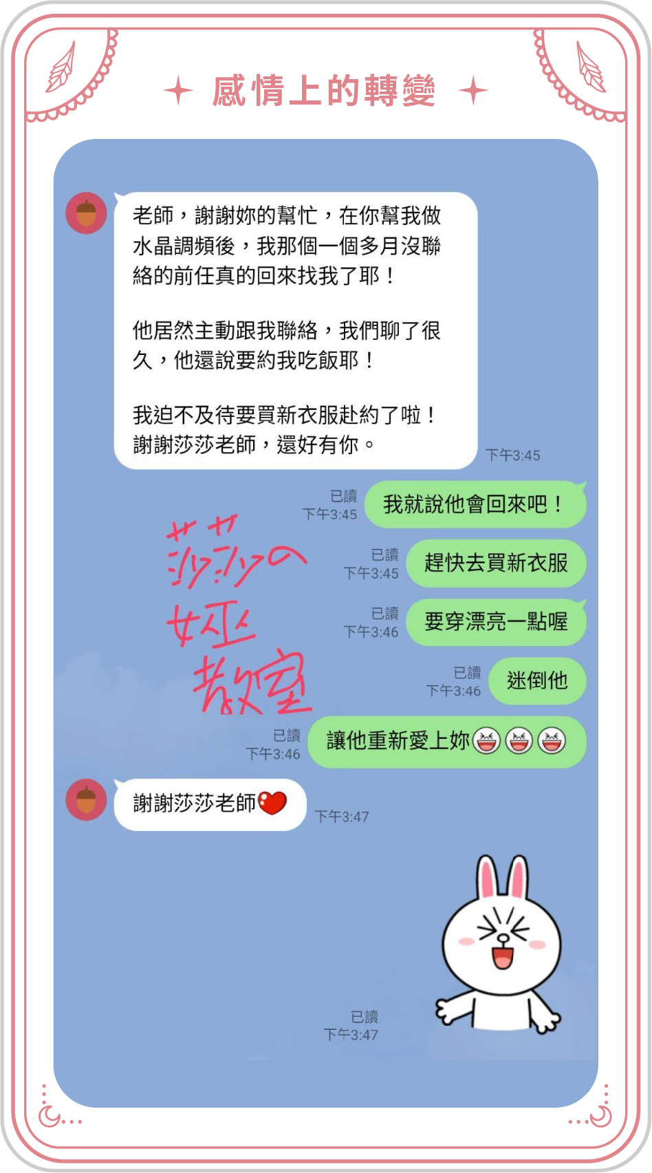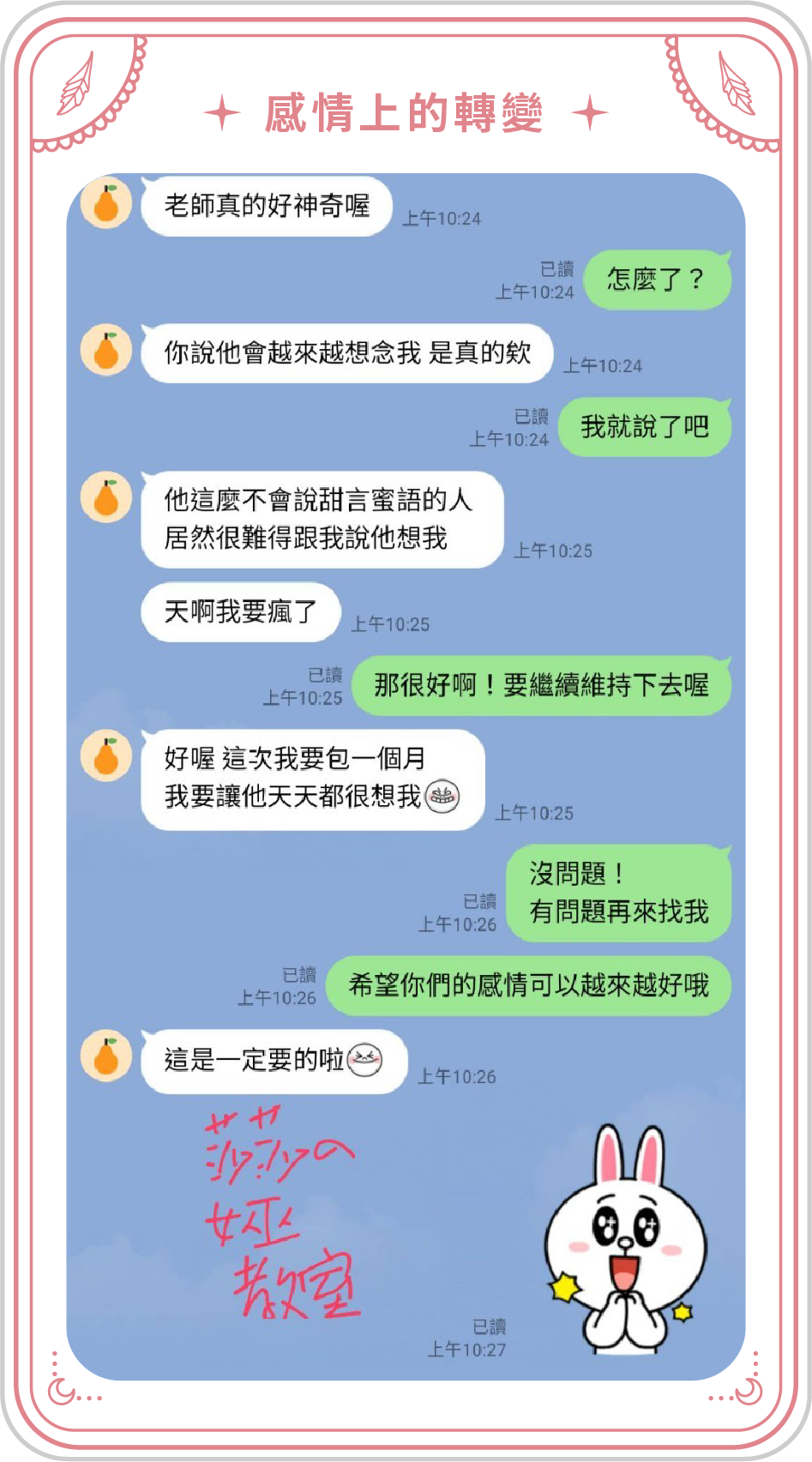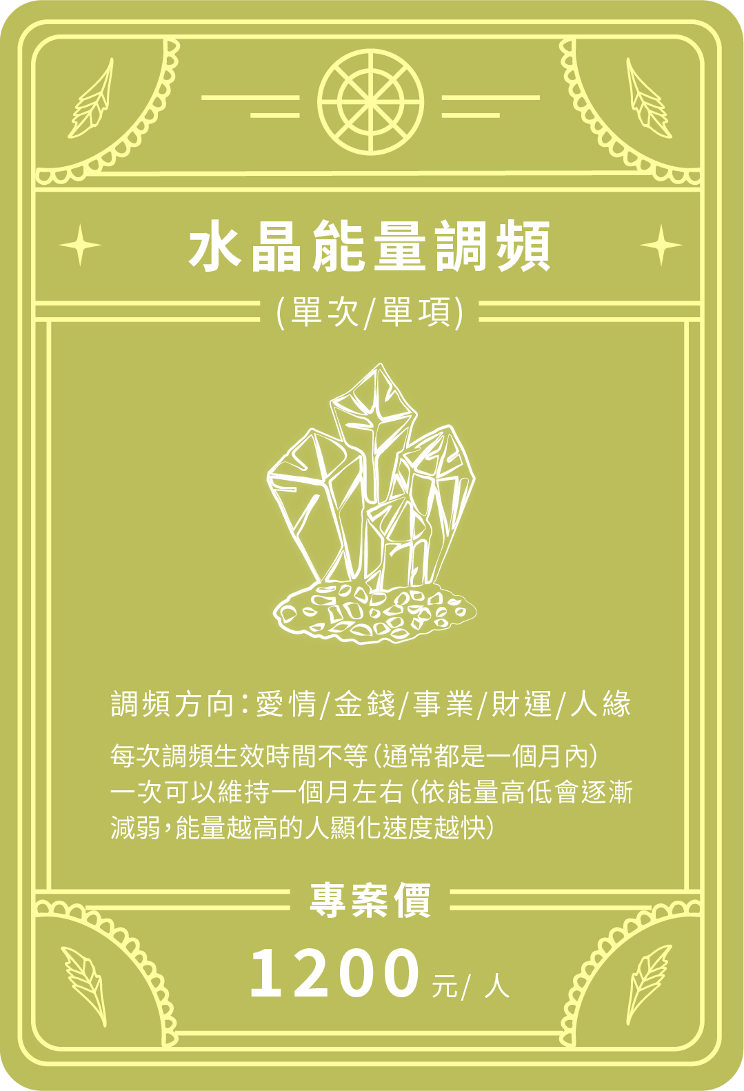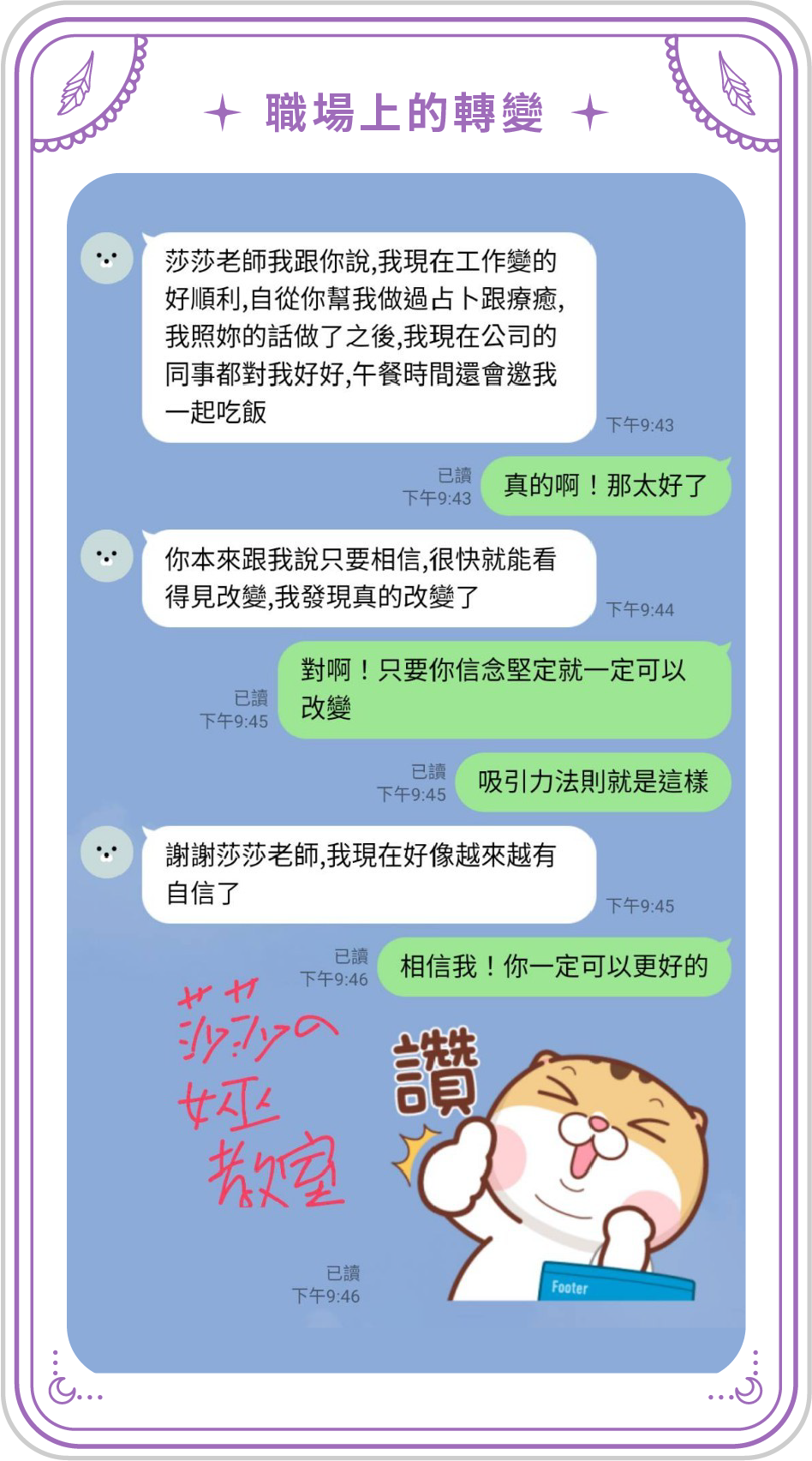 第二階段是判讀,依據您的狀況,她會使用塔羅占卜或潛意識溝通卡進行判讀,找出您內在未解決的課題,並提供解決方案或建議,時間約30-60分鐘。